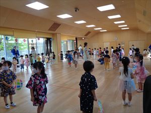 ホールに集まって自分で作ったうちわを持って盆踊りをしました。