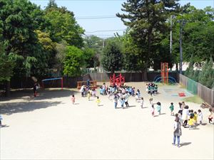 上履きのまま園庭に逃げてきます。