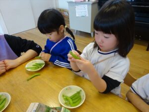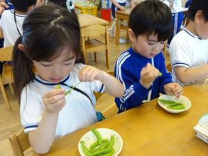 今日は年長さんが体操指導の後、栄養士の先生と一緒にスナップエンドウの