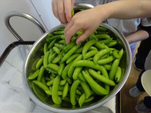 年長さんが手伝ってくれたスナップエンドウは明日のお給食で提供予定です。